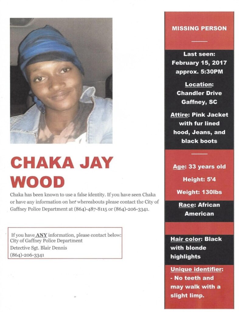 Chaka Jay Wood was 32 years old at the time of her disappearance in February 2017 in Cherokee County. According to NamUs and other online sites, Wood was last seen by her family at church in Gaffney, South Carolina, around 5:30 p.m. on February 15th.