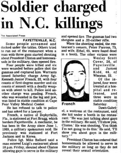 On August 6, 1993, an armed Fort Bragg soldier, Sgt. Kenneth Junior French, aged 22, walked into Luigi’s restaurant, 528 McPherson Church Road, around 10 p.m. in Fayetteville, North Carolina, with two shotguns and a rifle. French began to yell about politics, Bill Clinton, and homosexuality when he opened fire during the drunken killing spree. Four people were killed, and seven others were injured during the attack. Thankfully, Fayetteville Police Lt. Bill Simon crawled through a window and shot French, hitting the suspect in the leg and jaw.