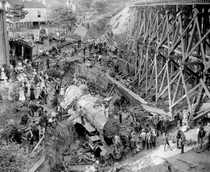 The route the train traveled was known to be dangerous with a combination of grades and tight curves. Signs were posted along the way to warn engineers to slow down, but due to a steep grade that ended at the 45-foot-high Stillhouse Trestle spanning Stillhouse Branch, the train could not slow. As it approached the curve leading to the trestle, it careened off the side of the bridge, plunging into the ravine below, killing 11 people on board.